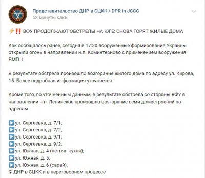 Украинские вооруженные формирования продолжают вести массированный обстрел юга ДНР, сообщает представительство Республики в СЦКК.