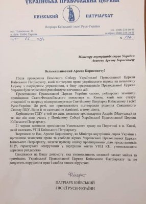 «Обращаюсь к вам, Арсен Борисович, как к министру внутренних дел Украины с просьбой защитить права и свободы верующих Украинской православной церкви Киевского патриархата, дать правовую оценку противоправным действиям представителей Православной церкви Украины (ПЦУ), гарантировать невмешательство во внутреннюю жизнь УПЦ КП, исключить церковное рейдерство», — говорится в обращении Филарета.