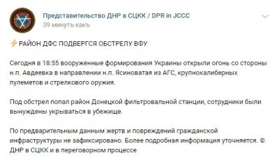 Украинские вооруженные формирования вечером, 24 июня, ведут обстрел ДНР сразу с нескольких направлений, под обстрел украинских боевиков попала Донецкая фильтровальная станция, сообщает представительство ДНР в СЦКК.