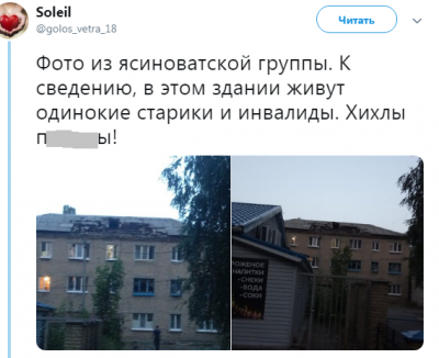 «ОПЯТЬ ОБСТРЕЛ ДНР СО СТОРОНЫ УКРАИНЫ! УДАРИЛИ ПРОТИВОТАНКОВОЙ РАКЕТОЙ ПО ДОМУ ПРЕСТАРЕЛЫХ. НАВЕРНОЕ, В ЧЕСТЬ ПЕРЕГОВОРОВ. Ясиноватая, улица Некрасова дом 11 А, только что. Вы что же делаете, солдаты Украины? Это же не штаб, не блиндаж, это дом престарелых! Бабушки целы. Напуганы, конечно, но целы. С кем же воюет Киев в Донбассе, и какова будет реакция? Те, кто должен защищать население – защитят или сглотнут?», — написал он.