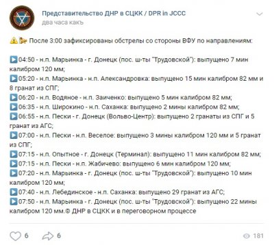 «С 4:50 до 7:50 зафиксированы обстрелы со стороны ВФУ по направлениям: Марьинка – поселок шахты «Трудовская», поселок Александровка; Пески – «Вольво-Центр», Веселое, Жабичево; Опытное – столичный аэропорт; Водяное – село Заиченко; Широкино – Саханка. В общей сложности выпущена 81 мина калибром 120 и 82 мм. Кроме того, применялись гранатометы», — сказано в сообщении.
