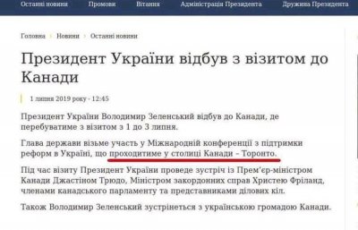 Пресс-служба президента Украины Зеленского, сообщая о намерении украинского президента посетить Канаду, перепутала столицу североамериканской страны. Пользователи сети сохранили копию новости с сайта президента страны.