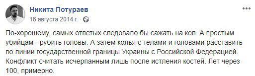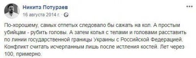 «Самых отпетых следовало бы сажать на кол. А простым убийцам – рубить головы. А затем колья с телами и головами расставить по линии государственной границы Украины с Российской Федерацией. Конфликт считать исчерпанным лишь после истления костей. Лет через 100 примерно», — написал он.
