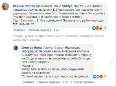 Ранее украинские журналисты подчеркнули, что Сарган сообщила именно Ярошу дату освобождения Вышинского.