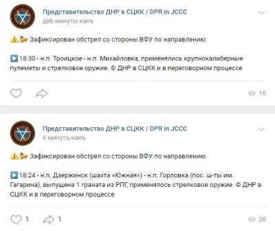 Украина продолжает провокационные обстрелы в ДНР несмотря на объявленное бессрочное перемирие. Представительство Республики в СЦКК сообщает, что ВСУ открыли огонь по ДНР с двух направлений.
