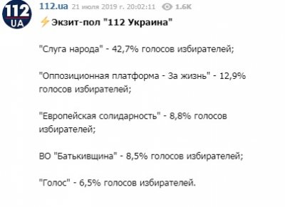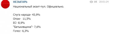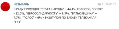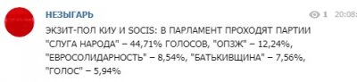 После закрытия избирательных участков на Украине были опубликованы официальные данные экзит-полов. Первое место на выборах в Верховную раду прогнозируемо заняла партия нынешнего президента Зеленского «Слуга народа». Второе за Оппозиционной платформой Бойко-Медведчука.