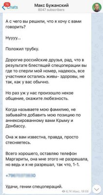 Дорогие российские друзья, рад, что в результате блестящей спецоперации вы где-то сперли мой номер, надеюсь, все участники остались живы- здоровы, не так, как у вас обычно. Но раз уж у нас произошло некое общение, окажите любезность. Когда называете мою фамилию, не забывайте добавить мою позицию по аннексированному вами Крыму и Донбассу. Она ж вам известна, правда, просто стесняетесь.