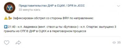 «Украинские оккупанты из 53-й бригады под командованием (Андрея) Полякова в 18.05 вновь нарушили достигнутые договоренности о соблюдении режима прекращения огня, обстреляв из автоматического гранатомета окраины поселка шахты 6/7 в Горловке. В результате обстрела один военнослужащий НМ получил ранение».