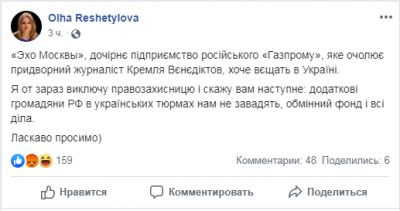 «Эхо Москвы», дочернее предприятие российского Газпрома, которое возглавляет придворный журналист Кремля Венедиктов, хочет вещать в Украине», — написала она на своей странице в Facеbook.