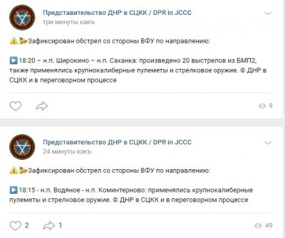 «С 14:20 до 14:40 зафиксированы обстрелы со стороны ВФУ по направлениям: село Саханка, поселок Трудовские и Ясиноватая», — сказано в сообщении.
