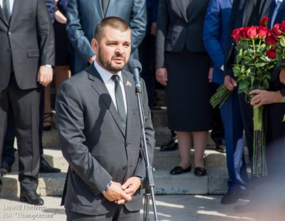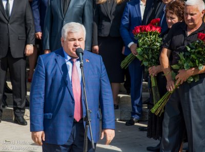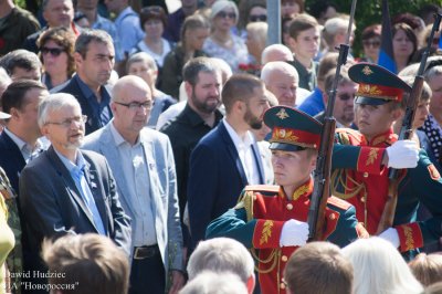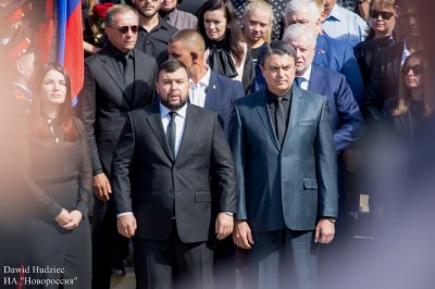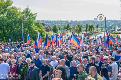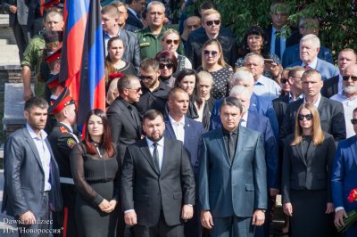 Официальные лица ДНР, ЛНР, дружественных государств – России, Абхазии, Южной Осетии, близкие Александра Захарченко, жители Донецка пришли почтить его память и возложить цветы к монументу.