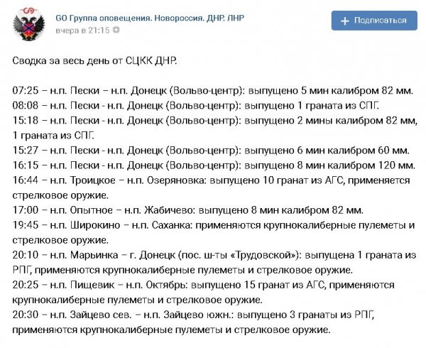 Новости об обстрелах поступали в течение всего дня и с территории Донецкой народной республики. Как сообщили в Совместном центре по контролю и координации режима прекращения огня, с 15:18 по 16:15 украинские боевики на севере Донецка выпустили 16 мин калибрами 60, 82 и 120 мм по направлению Вольво-центра, также была выпущена одна граната из СПГ.