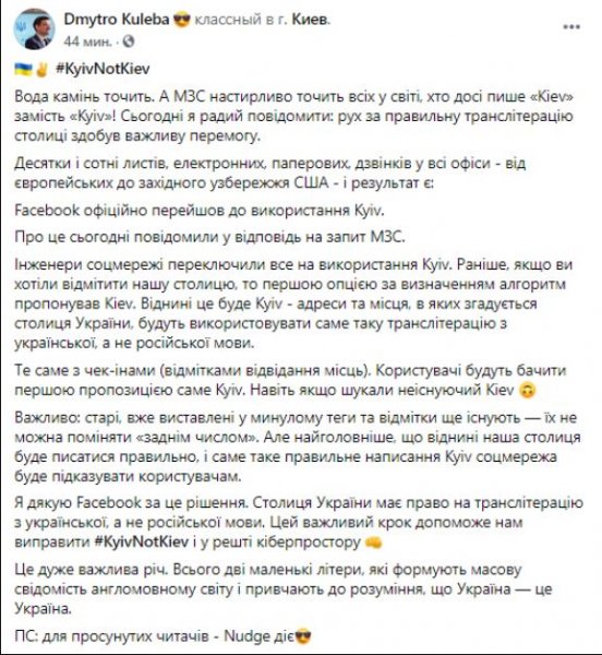 «Вода камень точит. А МИД настойчиво точит всех в мире, кто до сих пор пишет Kiev вместо Kyiv! Я рад сообщить, движение за правильную транслитерацию столицы одержало важную победу. Facebook официально перешел к использованию Kyiv. Инженеры соцсети переключили все на использование Kyiv. Ранее, если вы хотели отметить нашу столицу, то первой опцией по определению алгоритм предлагал Kiev. Отныне это будет Kyiv», — отметил в своём сообщении чиновник.