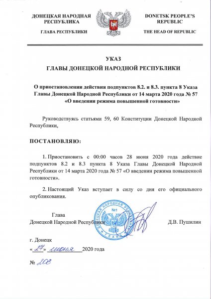 Новый указ приостанавливает с 28 июня действие пунктов указа «О введении режима повышенной готовности», касающихся пропуска через границу на территорию Украины и пропуска из Украины в ДНР.