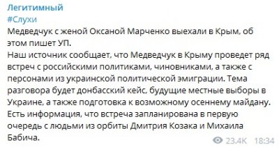 «Наш источник сообщает, что Медведчук в Крыму проведет ряд встреч с российскими политиками, чиновниками, а также с персонами из украинской политической эмиграции. Тема разговора будет донбасский кейс, будущие местные выборы в Украине, а также подготовка к возможному осеннему майдану. Есть информация, что встреча запланирована в первую очередь с людьми из орбиты Дмитрия Козака и Михаила Бабича», — пишет близкий к офису президента Украины Зеленского телеграм-канал «Легитимный».