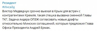 «Резидент» в свою очередь сообщает, что встреча Медведчука с «контрагентами Кремля» связана со сменой представителя Украины на минских переговорах.