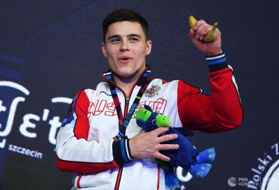 Талисман UEG также наградил бананом россиянина Никиту Нагорного, завоевавшего золото в индивидуальном многоборье.