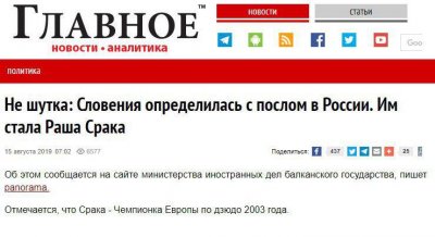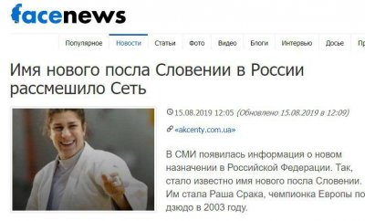 Украинские СМИ перепечатали материал пародийного сайта "Панорама" о том, что Словения назначила своим послом в России дзюдоистку Рашу Сраку (Rasa Sraka). В шуточном сообщении приводились слова "министра" Душана Сральковича (в действительности главу словенского МИД зовут Миро Церар).