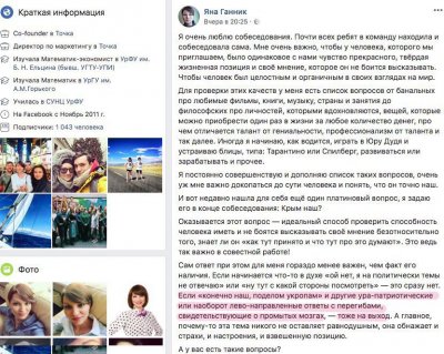 Вице-президент банка "Открытие", директор по маркетингу банка "Точка" Яна Ганник в Facebook рассказала, что проверяет соискателей работы в финансовой организации вопросом "чей Крым".
