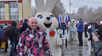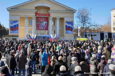 На площадке у кинотеатра "Россия" собрались сотни курганцев, чтобы солнечным мартовским утром вместе отметить значимую для страны дату.
