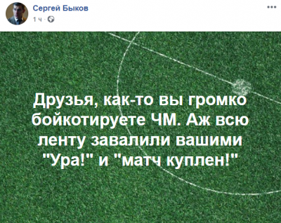 Общее настроение выразил Сергей Быков, указав, что украинцы, как ни старались, не смогли бойкотировать ЧМ и остаться равнодушными: