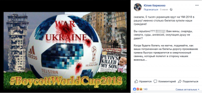 Конечно же, украинская общественность не была рада успехам российской сборной. На открытии ЧМ многие сокрушались, что все для России проходит слишком гладко. И злились на тех, кто не поддержал бойкот.