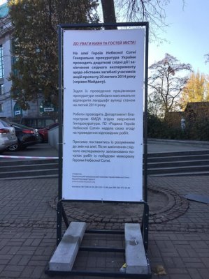 "Для их проведения работникам прокуратуры необходимо максимально воссоздать ландшафт улицы по состоянию на февраль 2014 года", - говорится на баннере на аллее Героев Небесной Сотни.