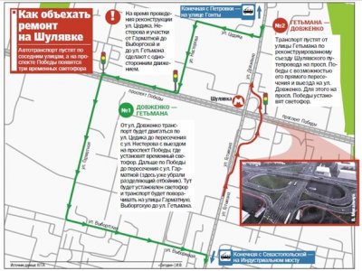 Проезд в направлении от улицы Александра Довженко к улице Вадима Гетьмана будет происходить по улицам Антона Цедика и Петра Нестерова, с выездом на проспект Победы.