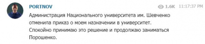 "Администрация Национального университета им. Шевченко отменила приказ о моем назначении в университет. Спокойно принимаю это решение и продолжаю заниматься Порошенко", - сообщил в своем Telegram-канале Портнов вечером 20 июня.
