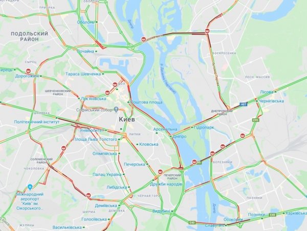 По данным Google Maps, значительные пробки образовались на всех основных мостах через Днепр, проспекте Романа Шухевича, бульваре Перова, проспекте Соборности, Дарницком мосту. Кроме того, пробки на бульваре Шевченко, проспекте Победы, проспекте Валерия Лобановского.