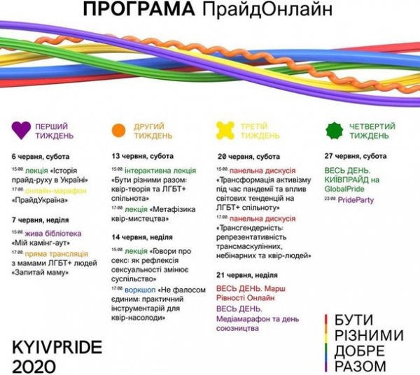 В течение месяца, начиная с 6 июня, каждую субботу и воскресенье Киев Прайд будет транслировать в соцсетях серию онлайн-ивентов о ЛГБТ+ и прайд-движении в Украине и в мире. Посмотреть их можно на YouTube-канале.