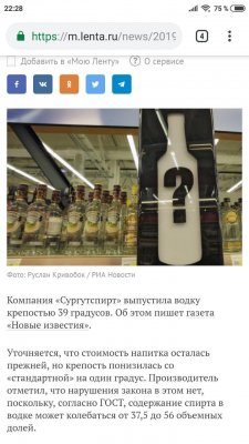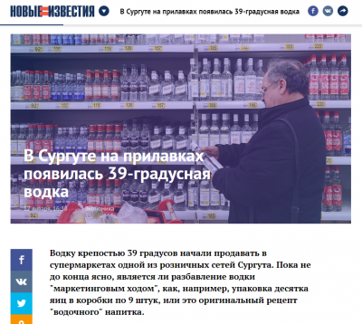 Издание "Лента.ру" поделилось со своими читателями "новостью" с сатирического сайта ИА "Панорама" о появлении в сургутских супермаркетах водки крепостью в 39 градусов.