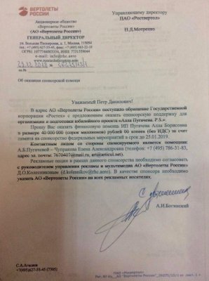 Об этом свидетельствует письмо от гендиректора госкорпорации Андрея Богинского в адрес управляющего директора ПАО "Росвертол" Петра Мотренко с просьбой "оказать финансовую помощь ИП Пугачева Алла Борисовна в размере 40 млн рублей". По словам Богинского, с таким предложением в "Вертолеты России" обратилась другая госкорпорация — "Ростех".