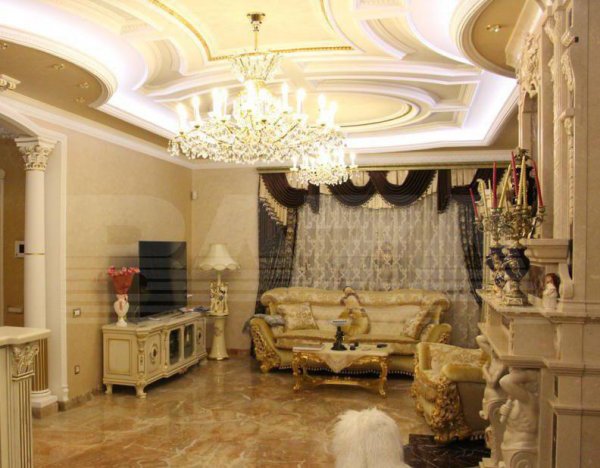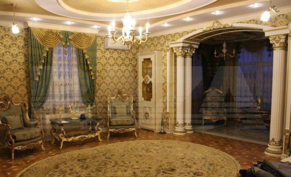 На снимках можно заметить колонны, обилие резной мебели, хрустальные люстры, мраморный пол и большое количество позолоты.