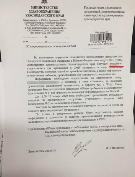 Как рассказал в Facebook кубанский журналист Александр Харченко, письмо, подписанное замминистра здравоохранения края Ириной Вязовской, получили 9 января директора и главврачи всех медучреждений, которые находятся в подчинении ведомства. Согласно распоряжению, медики должны каждый день отправлять на почту медицинского информационно-аналитического центра "материалы о ходе реализации нацпроектов, советы от специалистов, а также информацию о позитивных событиях, планируемых или происходящих в организации". Эти материалы, говорится в письме, будут опубликованы в СМИ.