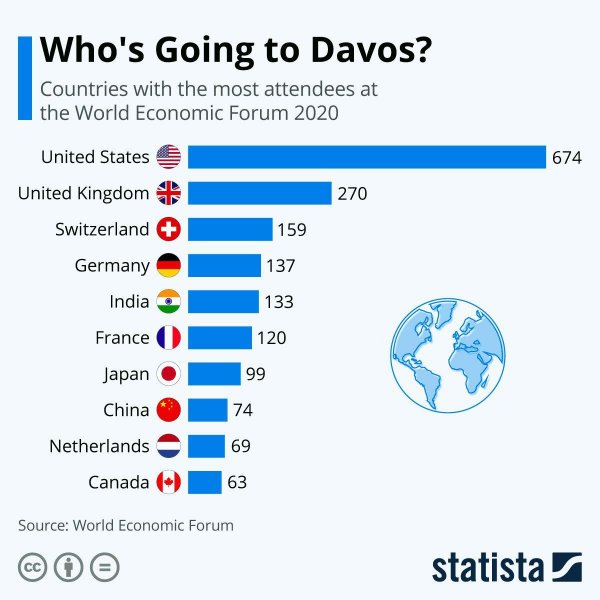 Канал "Рука рынка" обратил внимание на стартовавший в швейцарском Давосе Всемирный экономический форум. Как оказалось, наиболее широко представлен на нем американский бизнес — 674 участника от США. Ближайшие преследователи — Великобритания и Швейцария — представлены заметно скромнее: 270 и 159 участников соответственно. России в первой десятке, которую замыкают 63 канадца, не оказалось.