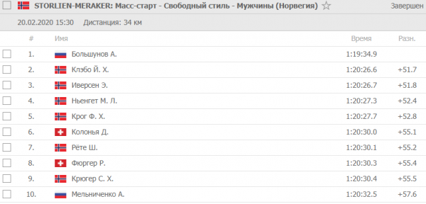 В середине дистанции семеро норвежцев зажали Большунова в "коробочку" и не дали взять бонусные очки. После этого обозленный российский лыжник вырвался вперед и уже не позволил себя догнать, опередив в итоге ближайшего преследователя более чем на 50 секунд. Итоговое время Большунова 1 час 19 минут и 34,9 сек. Затем финишировала плотная группа норвежцев: Йоханнес Клебо отстал от россиянина на 51,7 сек., Эмиль Иверсен — на 51,8 сек., Мартин Нюэнгет — на 52,4, Финн Крог — на 52,8.