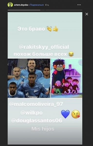 Игрок опубликовал фото, где помимо него и Ракицкого стоят Малком де Оливейра, Вильмар Барриос и Дуглас Сантос. Рядом размещен кадр из советского мультфильма про обезьян. Дзюба по-испански написал "Дети мои", разместив рядом никнеймы иностранных игроков.