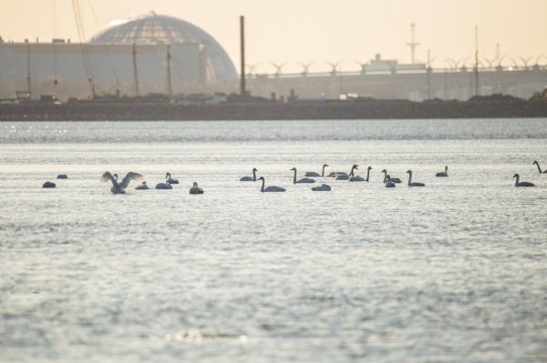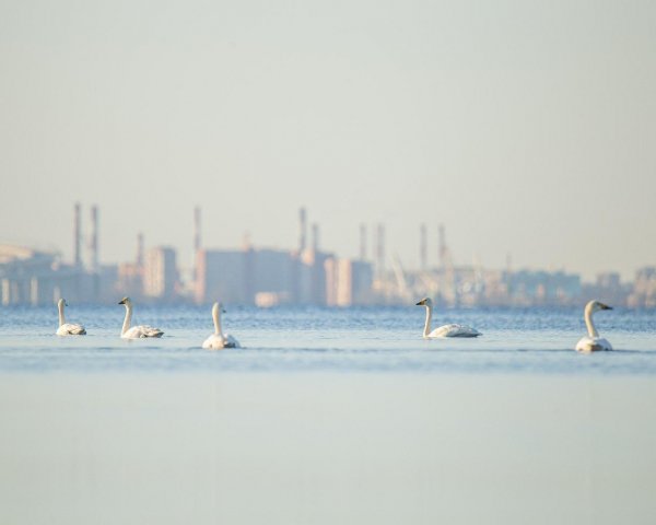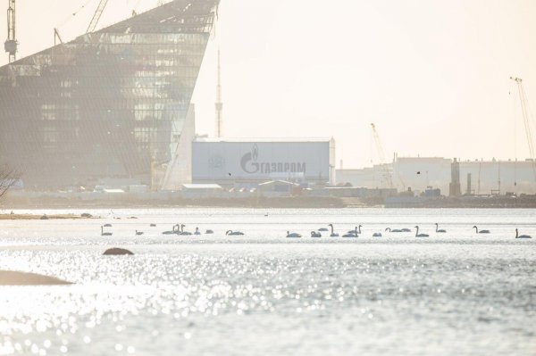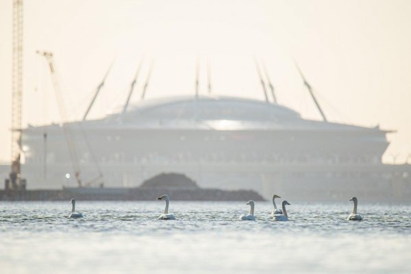 Возвращение диких животных в города в период самоизоляции человека продолжается. Канал FlashPiter выложил фото целой стаи лебедей-кликунов, снятых в Финском заливе на фоне "Газпром Арены".
