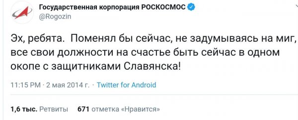 Twitter-аккаунт гендиректора "Роскосмоса" Дмитрия Рогозина теперь будет вестись от лица госкорпорации. При этом старые твиты пресс-служба решила не удалять, что привело к курьезным моментам, на один из которых указал канал "Суеверная демократия".