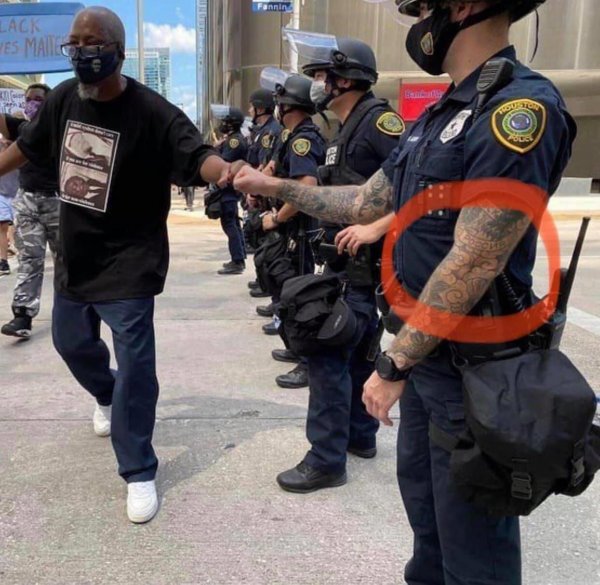 Внимательные пользователи рассмотрели на одном из видео с протестов в Хьюстоне (штат Техас) татуировку на руке полицейского с надписью "Россия". Кадр опубликовал канал "Новости. Как есть".