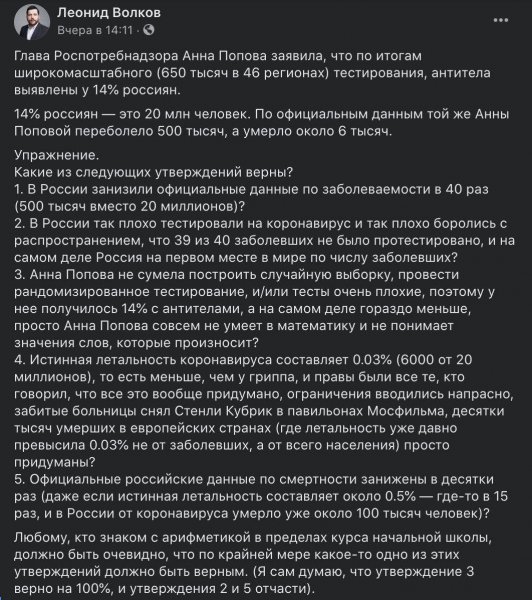 Канал "Минправды" прокомментировал слова Леонида Волкова, который ранее подверг сомнениям достоверность статистики по количеству россиян, заработавших иммунитет к коронавирусу. Согласно данным Роспотребнадзора, антитела выявлены у 14% россиян, что в целом коррелирует с общей заболеваемостью и показателями в других странах. Например, в Нью-Йорке антитела найдены у 20% жителей. Большинство из них не включено в число заболевших, поскольку люди перенесли болезнь в легкой форме или вовсе ее не ощутили.