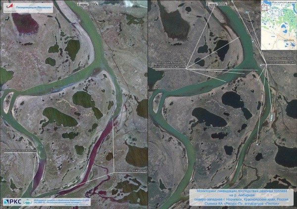 Канал "Нержавейка" выложил спутниковые фото реки Амбарная под Норильском, в которую попали нефтепродукты после аварии на ТЭЦ-3. На снимках, сделанных 4 и 10 июня, видно, что вода в реке спустя неделю вновь выглядит прозрачной, а загрязнение осталось в основном вдоль берегов.