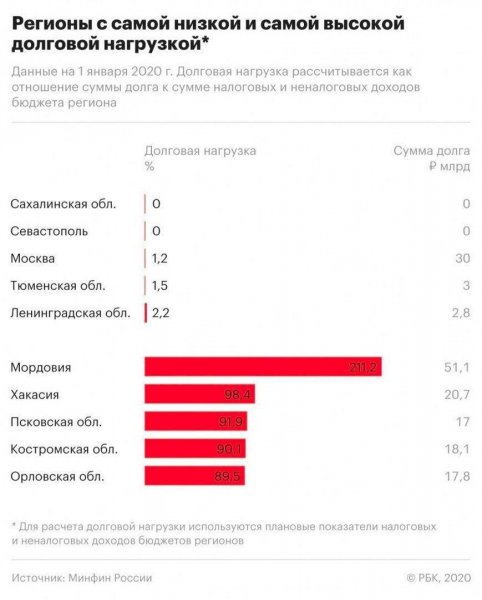 Канал "Рука рынка" опубликовал диаграмму, иллюстрирующую данные Минфина о долговой нагрузке на регионы. Показатель рассчитывается как отношение суммы долга к совокупному объему налоговых доходов бюджета региона. Среди лидеров с самым хорошим балансом оказались Сахалин и Севастополь, они вообще ничего не должны федеральному бюджету. Следом расположились Москва, Тюменская и Ленинградская области (1,2%, 1,5%, 2,2% соответственно). С другого конца рейтинга расположились Псковская область и Хакасия (17% и 20,7%), а главным аутсайдером оказалась Мордовия, дефицит бюджета которой составил 51,1%.