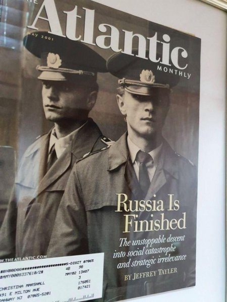 Канал "Железный занавес" напомнил о "пророческой" статье, вышедшей в 2001 году в американском журнале The Atlantic под громким заголовком "Russia is finished" ("России пришел конец"). Ее автор Джеффри Тейлeр называет не так давно занявшего пост президента Владимира Путина ставленником Запада, который был специально назначен с целью добить и без того пострадавшее в 90-е советское наследие. Журналист тогда был уверен, что Россия многие годы будет управляться Западом и в конце концов увянет и распадется. "Русские, вероятно, столкнутся с долгим, медленным, относительно мирным погружением в безвестность. Этот процесс уже идет полным ходом", — резюмировал Тейлер.
