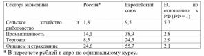 Производительность труда в России и Европейском союзе в основных секторах экономики (среднее значение в 2017 году, в евро в расчете на 1 чел.-час)