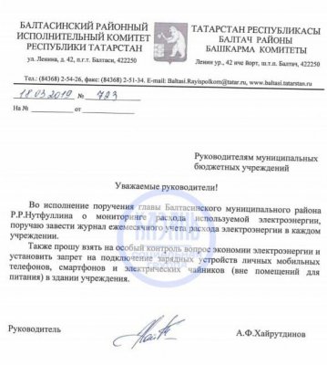 В Балтасинском районе Татарстана учителям и врачам запретили заряжать телефоны на рабочих местах. Соответствующее распоряжение подписал руководитель исполкома района Айдар Хайрутдинов.