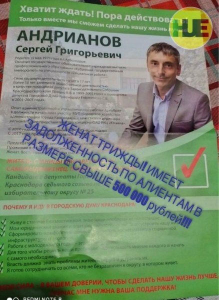 Жительница Кубани обнаружила своего экс-мужа, задолжавшего ей около полумиллиона рублей в виде алиментов, среди кандидатов в депутаты станицы Елизаветинская. Сергея Андрианова теперь разыскивает не только бывшая жена, но и судебные приставы, сообщает канал HUE.