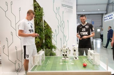 На стенде Сбербанка присутствуют и роботы. В этот раз их научили зажигательно танцевать и, конечно же, играть в футбол (акселерационная программа Сбербанка по робототехнике).