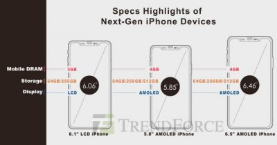 Что касается двух премиальных AMOLED-версий, они оба будут иметь объем оперативной памяти 4 ГБ. 5.8-дюймовый будет “преемником” iPhone X, но с более низкой стартовой ценой $899 – $949. 6.5-дюймовая версия будет нацелена на премиальный бизнес-сегмент. Она также будет оснащена функцией Dual-SIM. Но ожидается, что эта функция будет доступна только в определенных регионах. Цена смартфона составит около $1000.